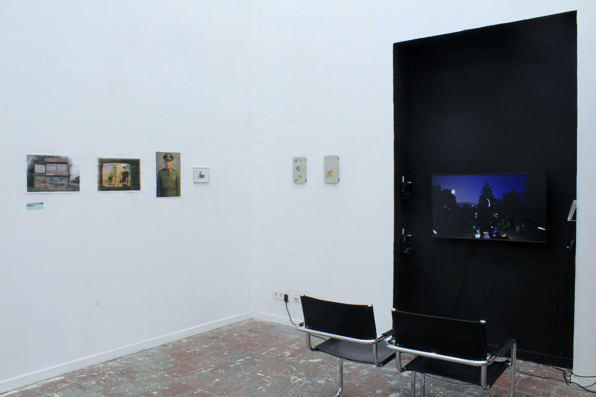 2 paper-mache sheets made of coffee cups with rice, dried leaves, and ID card-sized archival photographs, 16 of 3 x 1 mm size magnets, 10 of 20 x 20 mm size pipe clamps, and a 3M VHB tape