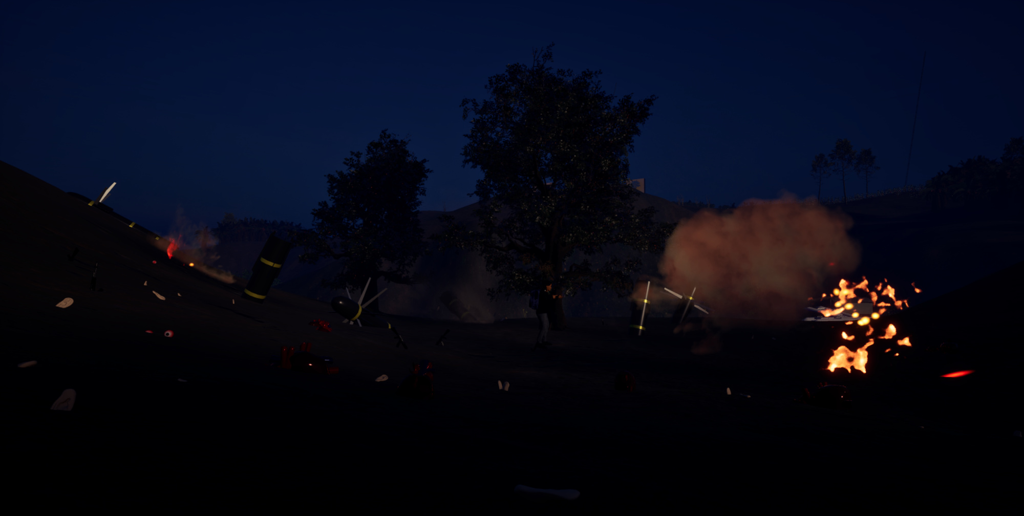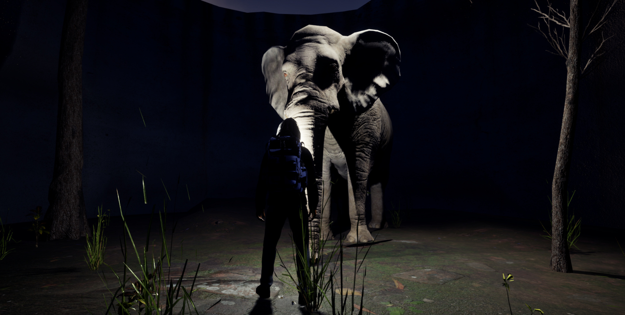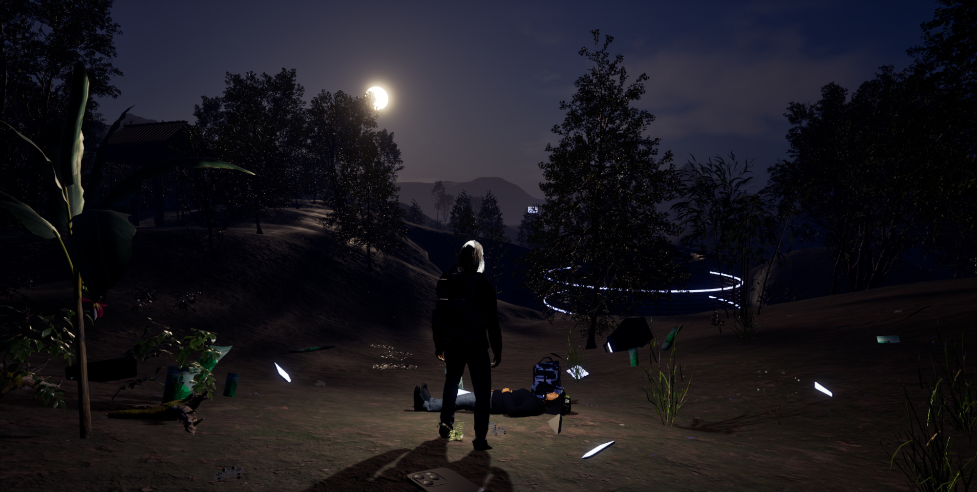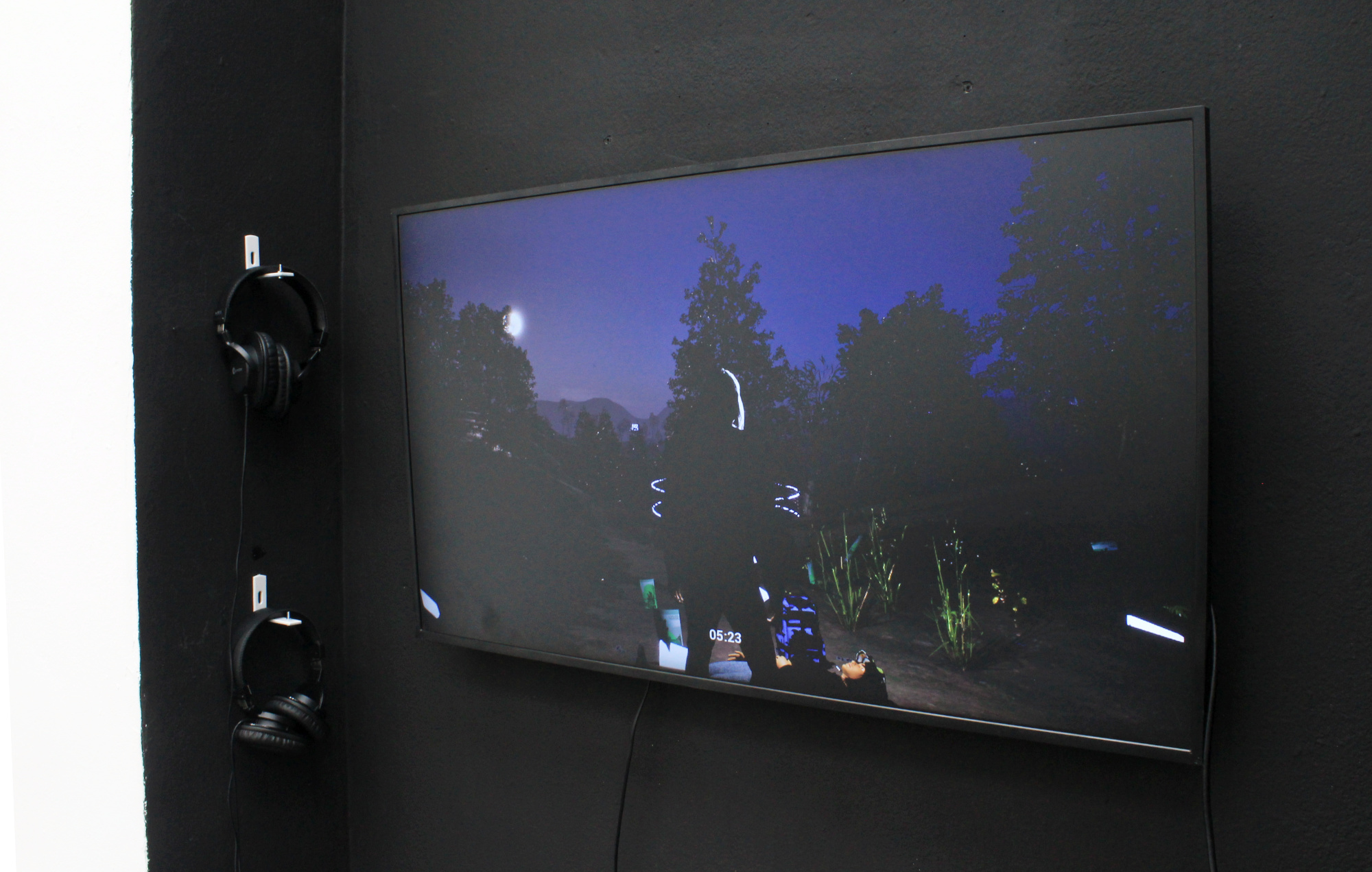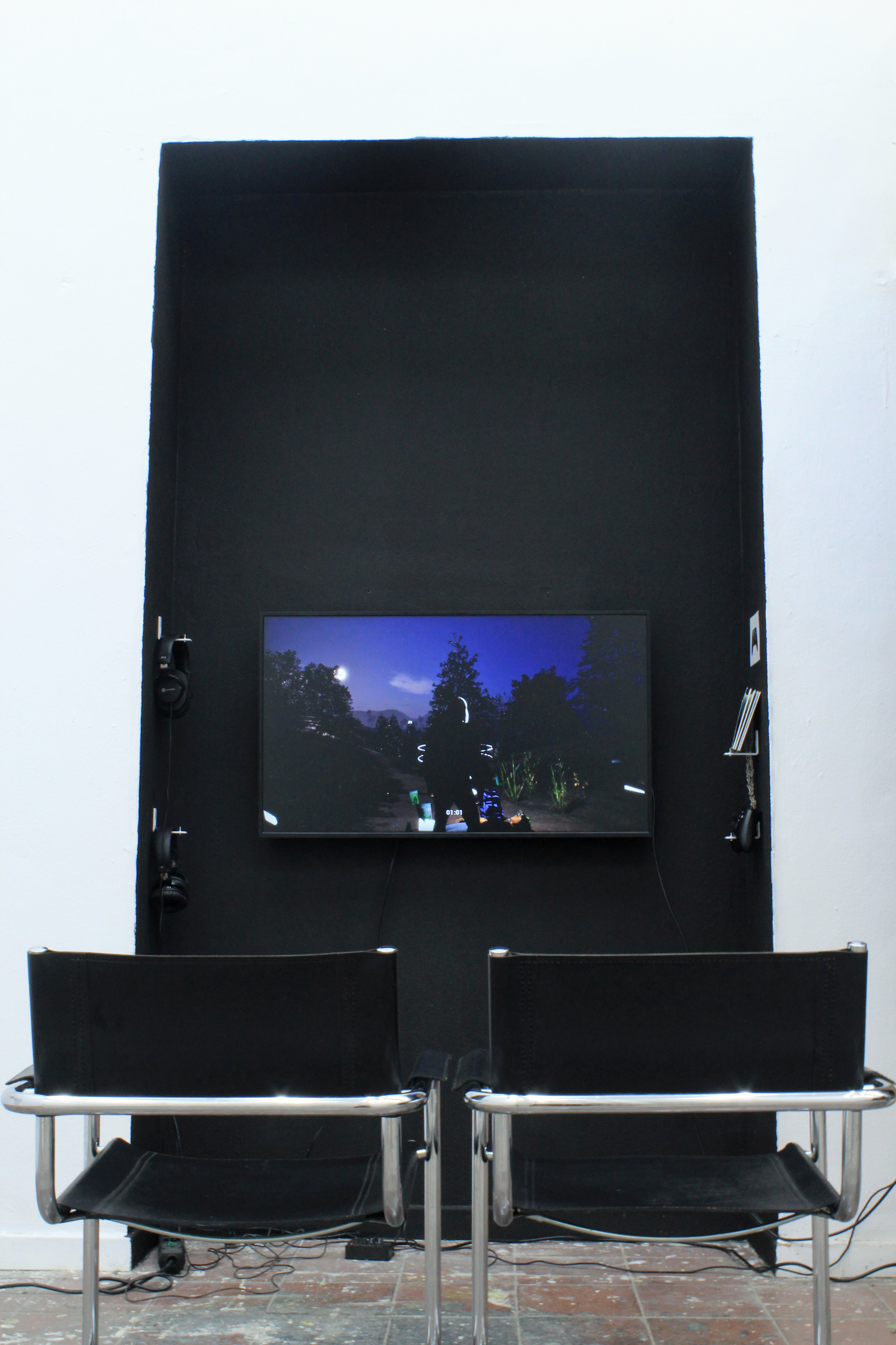 A participatory computer software that will reset every 6 minutes, a gamepad, two headphones, a Windows operating system computer with at least 8gb RAM, a 43-inch TV, a 2,4 meter height and 1.6 meter wide black wall
