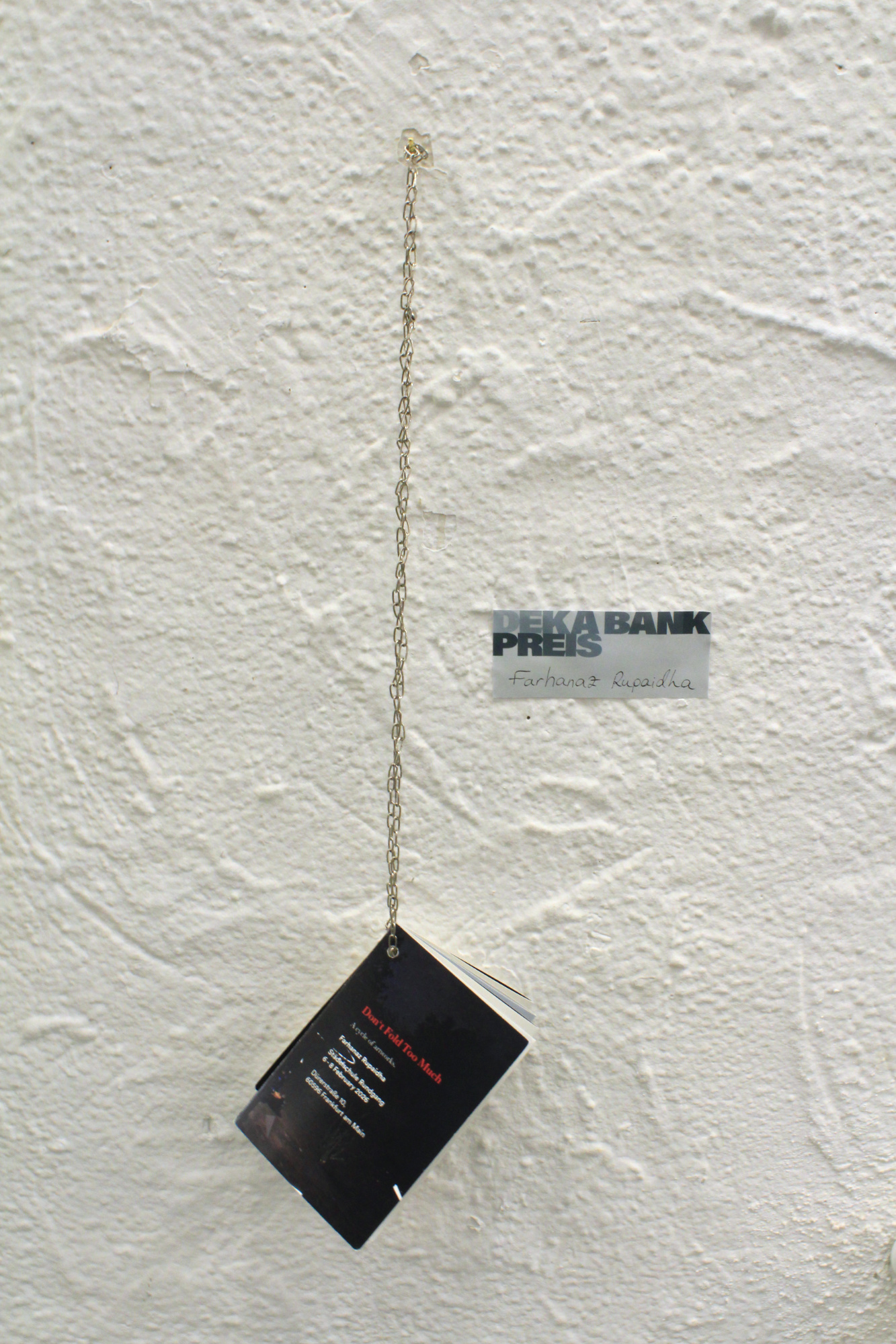 Watercolour and acrylic with hand embossing on paper, 5 meter long chain, a neon lamp, and a 98,3 cm aluminium rod