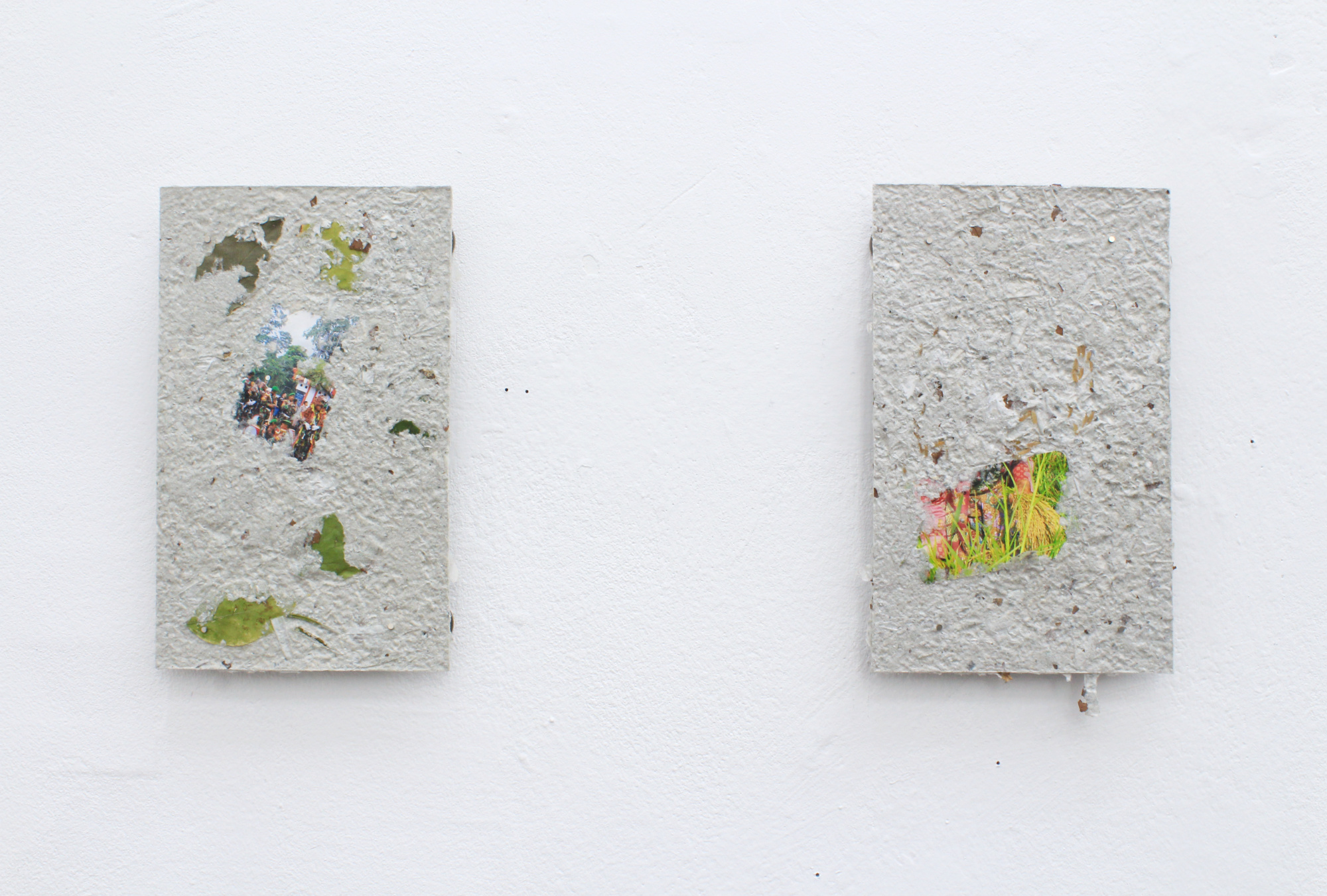 2 paper-mache sheets made of coffee cups with rice, dried leaves, and ID card-sized archival photographs, 16 of 3 x 1 mm size magnets, 10 of 20 x 20 mm size pipe clamps, and a 3M VHB tape